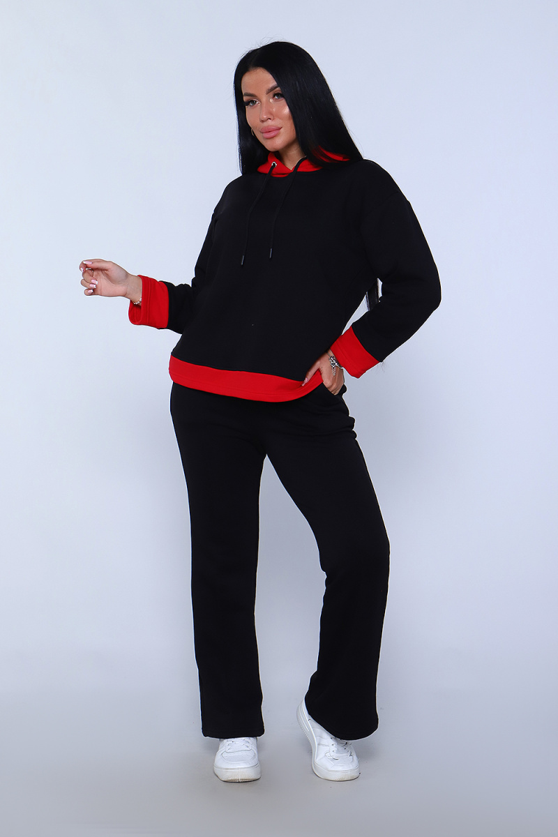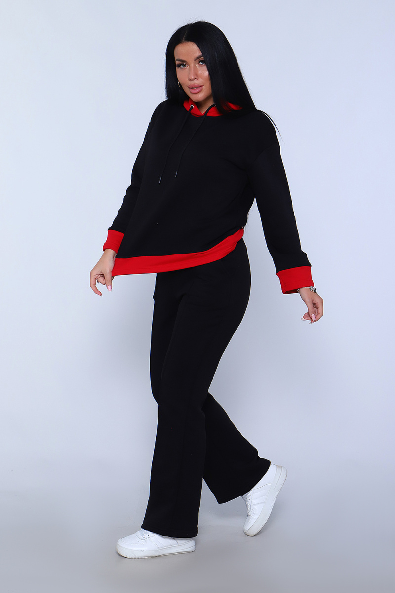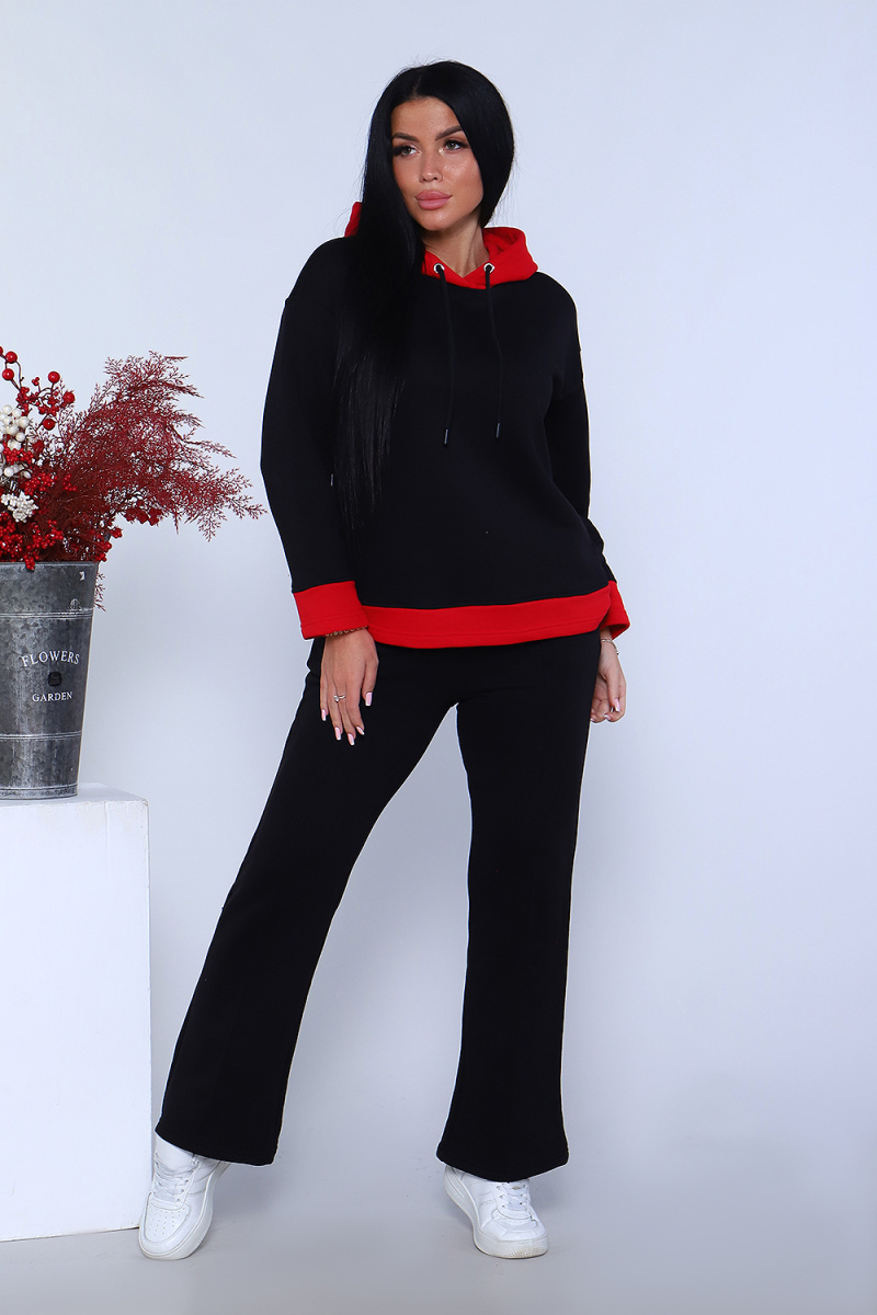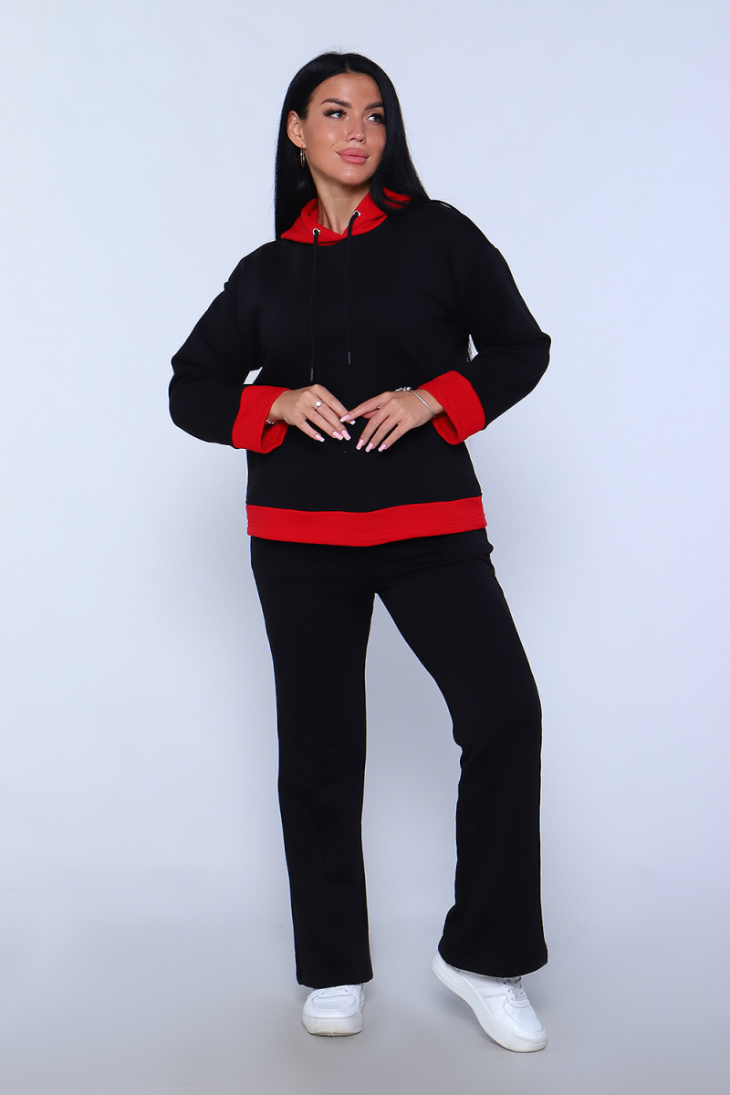 Элегантный женский костюм полуприлегающего силуэта, состоящий из худи и брюк сшит из трикотажного полотна премиум качества - футер 3-х нитка петля без начеса. Высокое качество ткани обеспечит комфорт и удобство на долгое время. Хлопковая изнаночная сторона изделия дарит комфортные ощущения при ношении костюма. Брюки силуэта клеш с широким поясом с декоративной отсрочкой и с отстроченной стрелкой на передней половине брюк, что "вытягивает" силуэт и визуально делает ноги длиннее, что добавляет женственности образу. В боковых швах брюк расположены карманы с отрезным бочком. Худи прямое, свободное с длинными рукавами. Низ рукава и низ худи отделаны декоративными манжетами контрастного цвета. Вырез горловины округлый, с двойным капюшоном контрастного цвета в тон манжет. Объём капюшона регулируется декоративным шнурком. Сочетание комфорта и стиля делает этот костюм модным и удобным для каждой девушки и женщины. Идеальный комплект обеспечивает удобную посадку на любую фигуру, позволяет свободно двигаться, гулять, от
