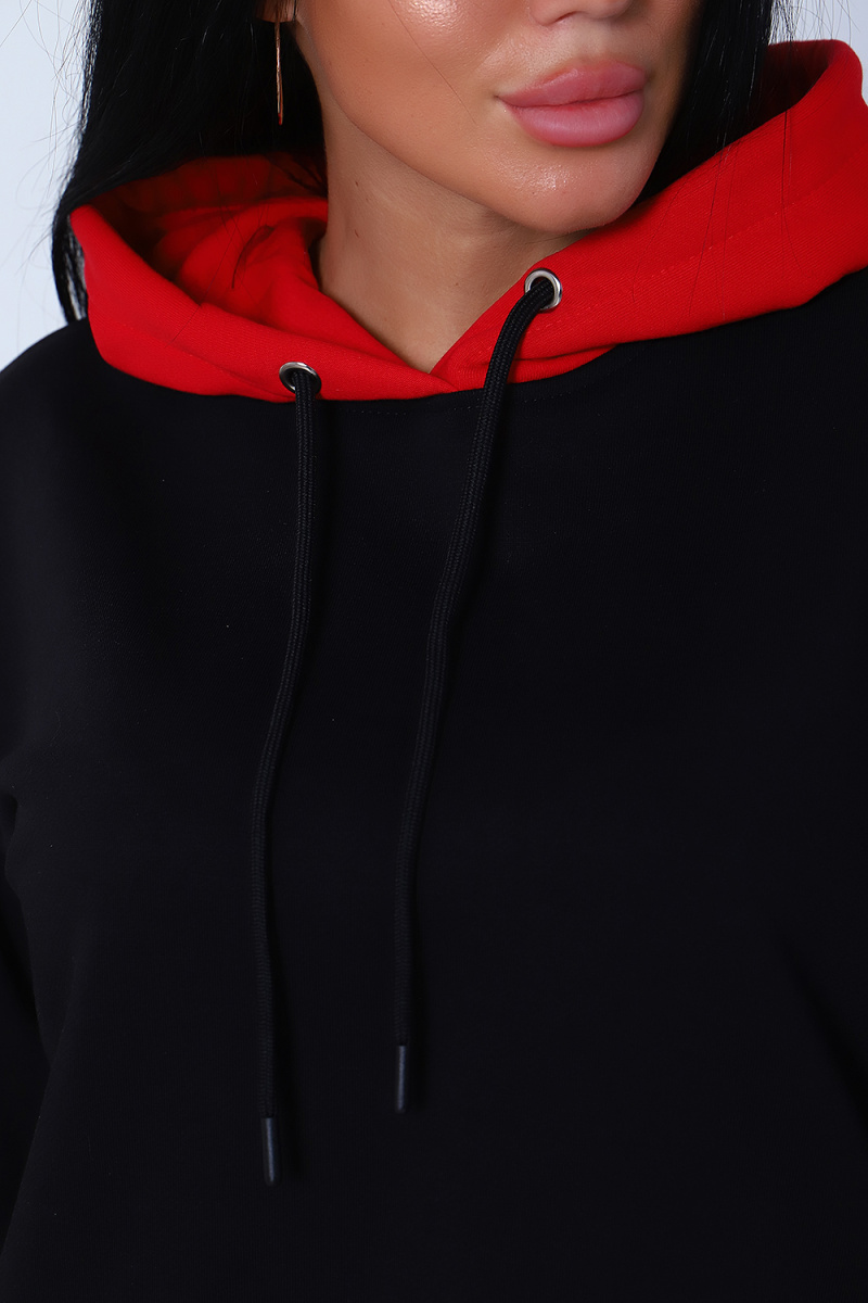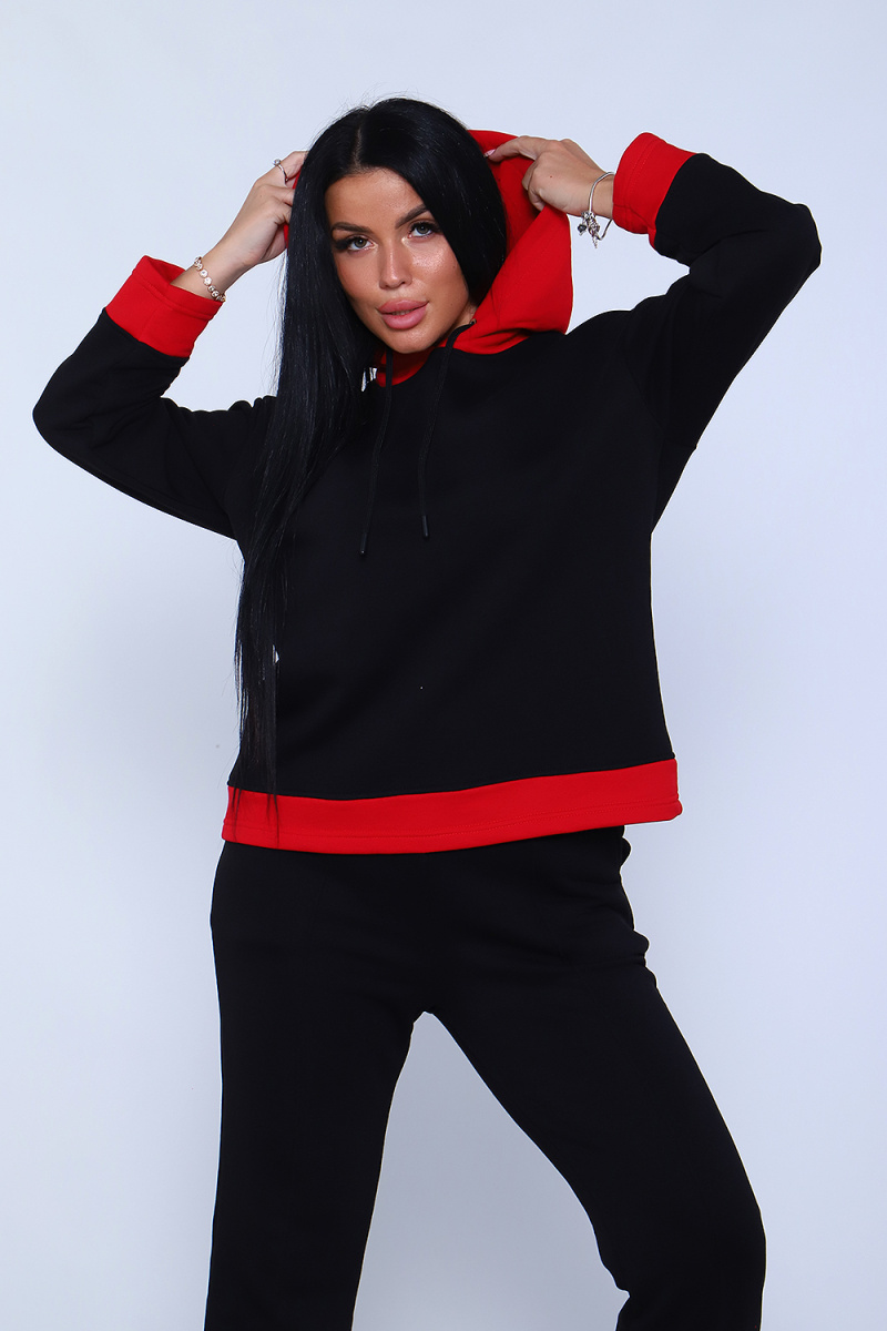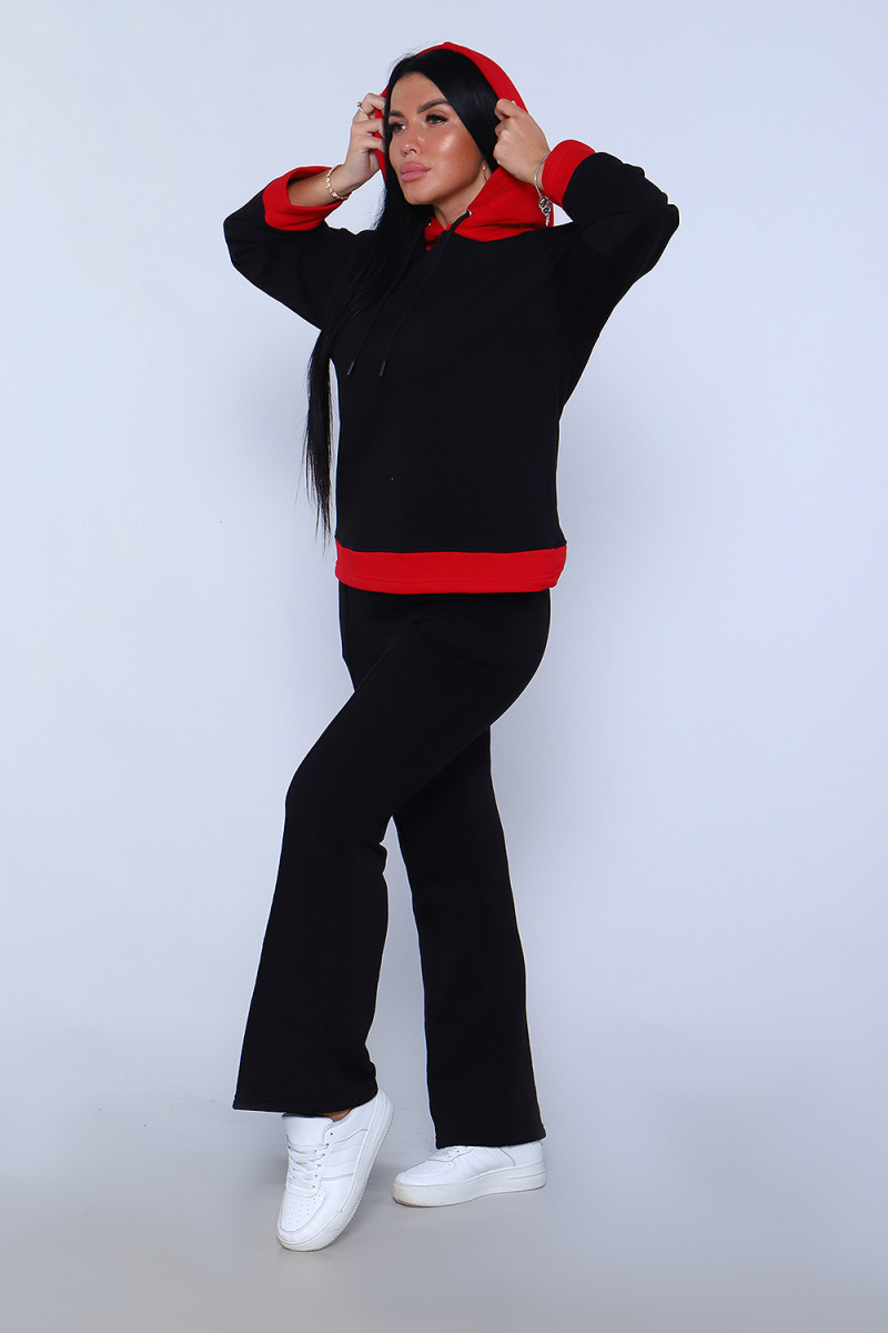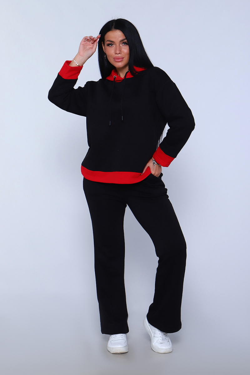 Элегантный женский костюм полуприлегающего силуэта, состоящий из худи и брюк сшит из трикотажного полотна премиум качества - футер 3-х нитка петля без начеса. Высокое качество ткани обеспечит комфорт и удобство на долгое время. Хлопковая изнаночная сторона изделия дарит комфортные ощущения при ношении костюма. Брюки силуэта клеш с широким поясом с декоративной отсрочкой и с отстроченной стрелкой на передней половине брюк, что "вытягивает" силуэт и визуально делает ноги длиннее, что добавляет женственности образу. В боковых швах брюк расположены карманы с отрезным бочком. Худи прямое, свободное с длинными рукавами. Низ рукава и низ худи отделаны декоративными манжетами контрастного цвета. Вырез горловины округлый, с двойным капюшоном контрастного цвета в тон манжет. Объём капюшона регулируется декоративным шнурком. Сочетание комфорта и стиля делает этот костюм модным и удобным для каждой девушки и женщины. Идеальный комплект обеспечивает удобную посадку на любую фигуру, позволяет свободно двигаться, гулять, от